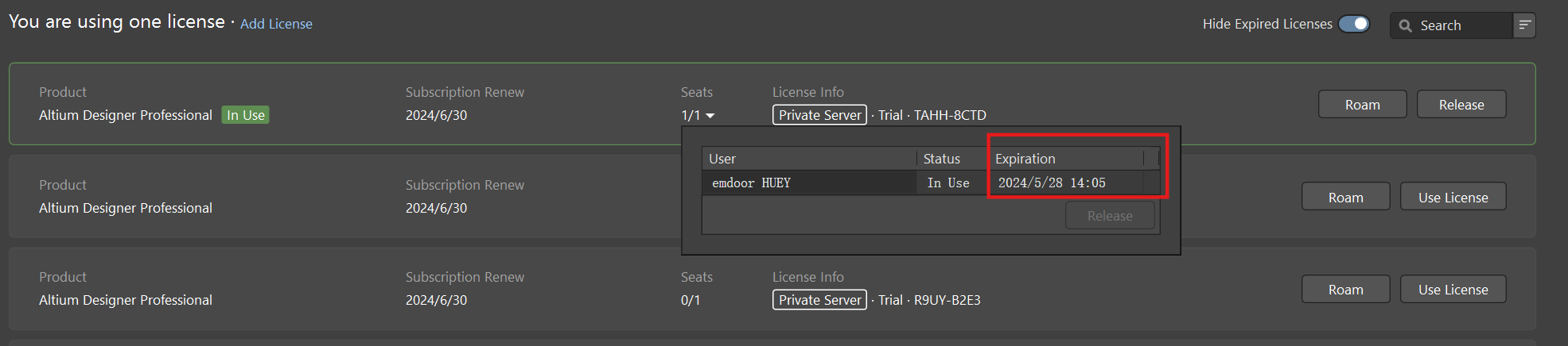 ○ 重啟Altium Designer客戶端并重新連接許可證服務器,此時License可正常使用,如圖5。