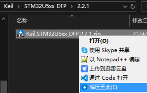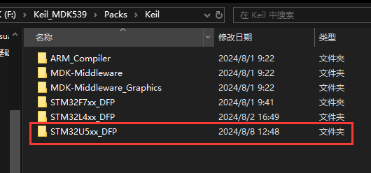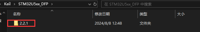 2)、打開Keil安裝路徑,找到芯片包的存儲目錄(一般就是安裝keil時的packs路徑),在此文件夾下新建名為"XXXX_DFP"的文件夾(名稱為你要添加的芯片包的名稱,如"Keil.STM32U5xx_DFP.2.2.1.pack"就填中間那段"STM32U5xx_DFP",如下圖: