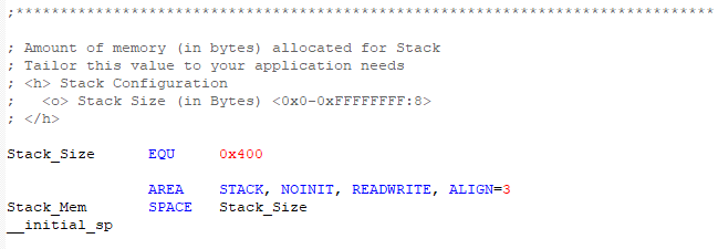 Stack_Size EQU 0x400:定義棧的空間大小1024字節。
