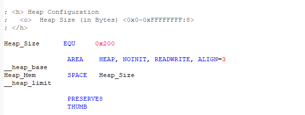 Heap_Size EQU 0x200:定義堆大小為512字節