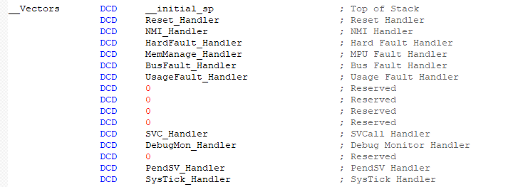 Reset_Handler定義的是復位中斷的函數指針,NMI_Handler到SysTick_Handler就是內核中斷的函數指針。
