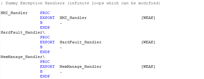 這里要進行說明的是[WEAK],weak標記說明:如果使用這個備用的函數(外部文件中沒有XXX_Handler),這里的B指令用nop替換,讓編譯器忽略,外部找不到任何NMI_Handler函數時的警告或錯誤。