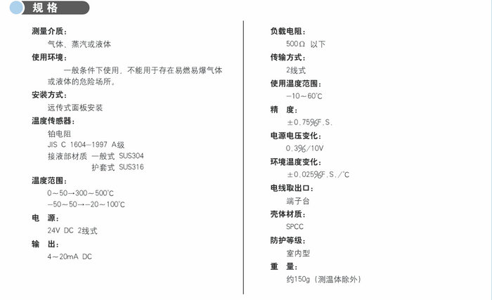 感溫部由鉑電阻構成,且感溫部與變送部分分開。適用于測量室溫、油溫、空調等溫度。
