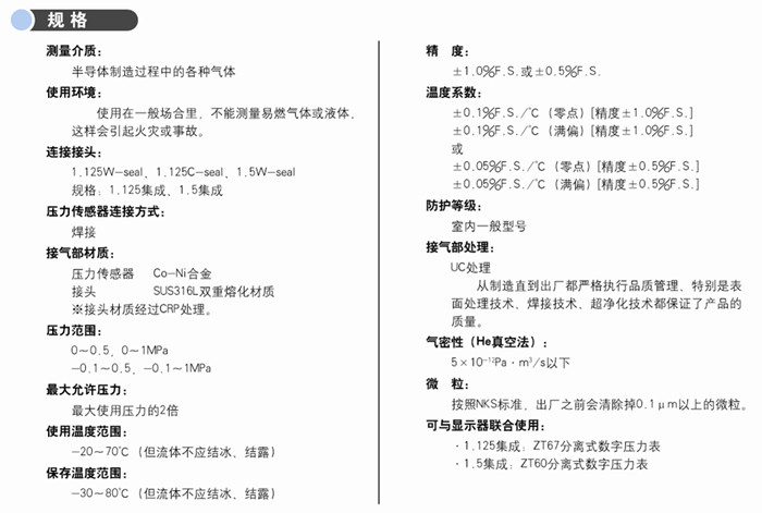 符合半導體行業氣體供給系統的集成化產品。此產品能與分離式壓力表(ZT60、ZT67)聯合使用。該產品有W-seal和C-seal兩種表面安裝方式可供選擇。材質為Co-Ni合金的傳感器元件,具有卓越的可靠性和耐久性。