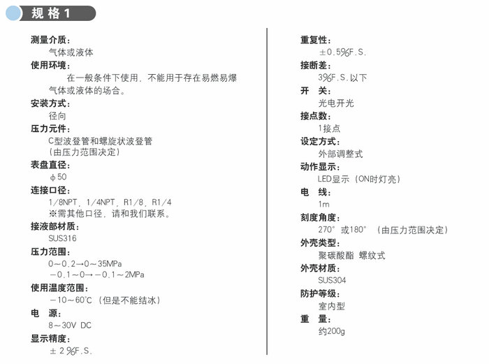 本產品是小型帶接點壓力表,內置了可靠性的光電開關,主要用于控制報警輸出和繼電器的開關等