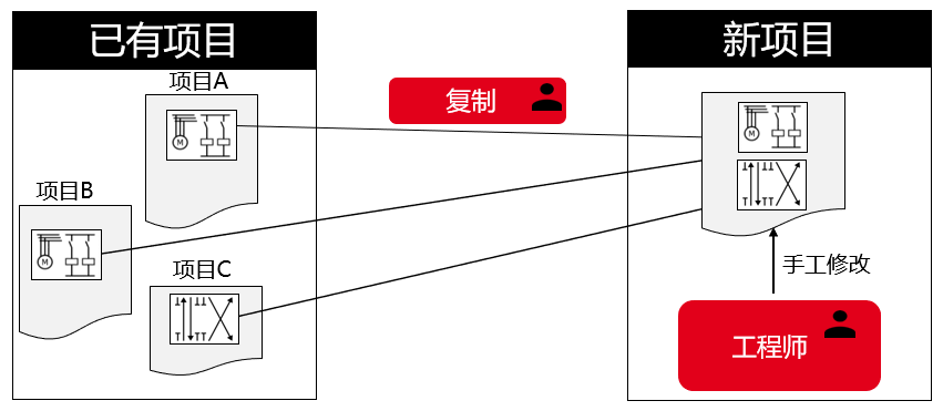 EPLAN推出的配置式出圖解決方案完美契合線體商們的需求。配置式出圖我們稱之為CTO設計模式,即Configuration to order。通過配置的方式來快速出圖,大幅度縮短電氣工程師出圖時間。配置式出圖解決方案是基于EPLAN宏技術實現圖紙的復用,即便是非標產品,也能夠分解出來可以復用的功能塊,將這些功能塊定義為EPLAN的“宏”,EPLAN Cogineer根據條件來選擇宏和參數,能實現配置式出圖。采用CTO設計模式之后,我們可以根據銷售訂單中的配置信息,使用Cogineer快速生成標準圖紙,在Electric P8 進行簡單的細節調整之后,就可以完成項目圖紙(包含電氣原理圖和氣路圖)繪制。