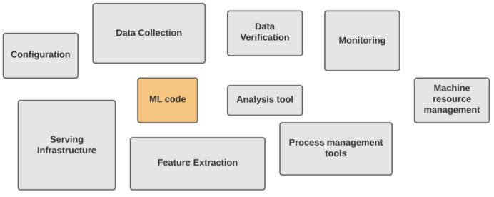Google 的團(tuán)隊(duì)一直在對(duì)構(gòu)建基于 ML 的系統(tǒng)所帶來(lái)的技術(shù)挑戰(zhàn)進(jìn)行大量研究。 一篇關(guān)于機(jī)器學(xué)習(xí)系統(tǒng)中隱藏的技術(shù)債務(wù)的 NeurIPS 論文表明,開(kāi)發(fā)模型只是整個(gè)過(guò)程的一小部分。 許多其他流程、配置和工具將被集成到系統(tǒng)中。如下圖所示: