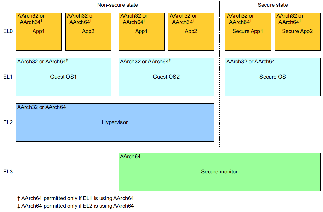 - EL3提供了兩個安全狀態之間切換的支持,安全狀態和非安全狀態。