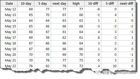 數(shù)據(jù)集為某地未來 30 天內每一天相對應的第二天、未來 5 天和未來 10 天的預報高溫(用華氏度表示)。數(shù)據(jù)表還包括每天的實際高溫,以及預報高溫和實際高溫之差。