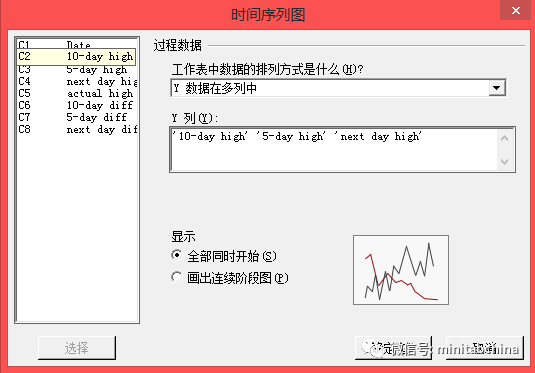 您正在調查預報高溫與實際高溫的匹配程度。這些數(shù)據(jù)按照發(fā)生順序進行記錄,因此,對隨時間變化的變量進行圖形化可能非常有用。選擇“時間序列圖”。