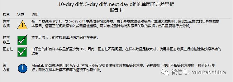 單擊“確定”,Minitab 將生成用于解決此分析假設的報告卡、用于幫助識別數(shù)據(jù)模式的診斷報告,以及下面的匯總報告。