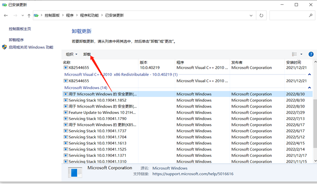 卸載Windows更新步驟:控制面板 > 程序 > 程序和功能 > 查看已安裝的更新,選擇KB5016592或者近期其他有關(guān).Net Framework的更新,并點擊“卸載”。