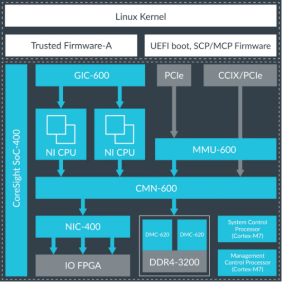 | Arm 提供的軟件功能 | SCP 固件:系統初始化、冷啟動流程、控制時鐘和設備管理。 可信固件-A:為 Armv8-A 提供安全世界軟件的參考實現,包括在異常級別 3 (EL3) 下執行的安全監視器。 64 位 Linux 驅動程序,包括用于 PCIe、CCIX、SMP 等的驅動程序。 UEFI 和 ACPI 支持。 用于下載包括 Linux 內核在內的開源組件的腳本。 |