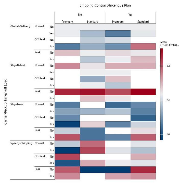 您還可以創建熱圖來調查分類因素,例如產品、運輸承運人、預定取貨時間以及您是否有運輸合同或運輸獎勵措施。
