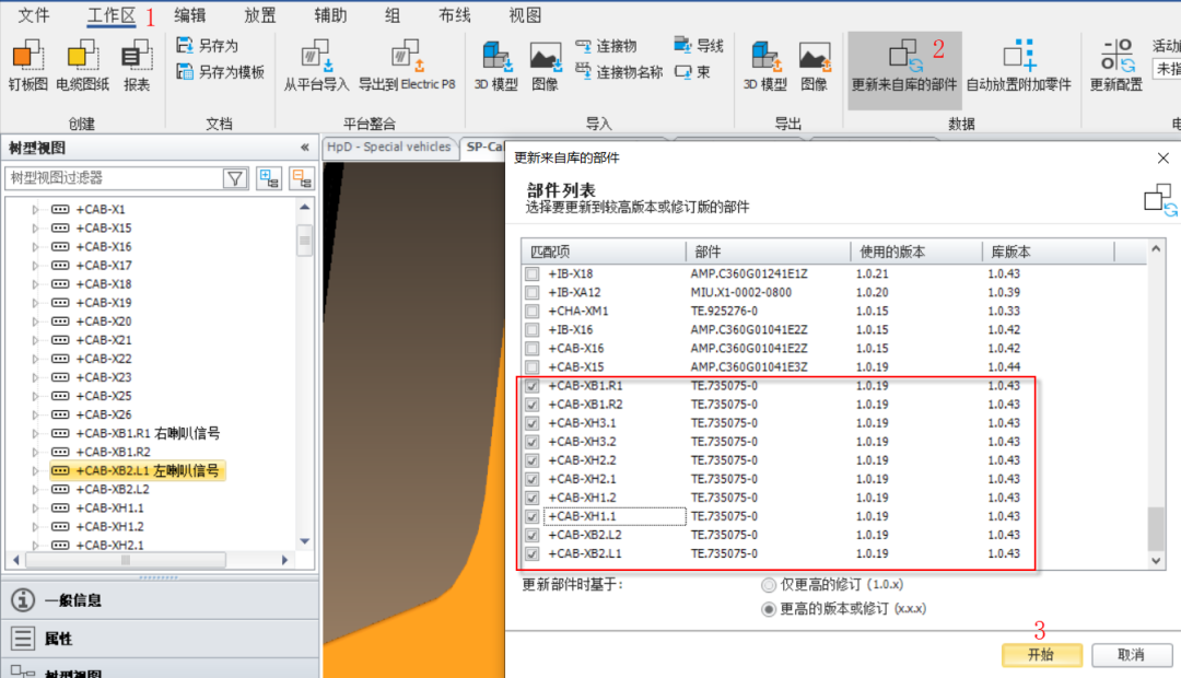 在EPLAN Harness?proD Studio的工作區中的菜單欄【工作區】-【更新來自庫的更新】,在彈出的【更新來自庫的部件】對話框中,勾選要更新的部件,點擊【開始】,Harness自動替換更新部件。