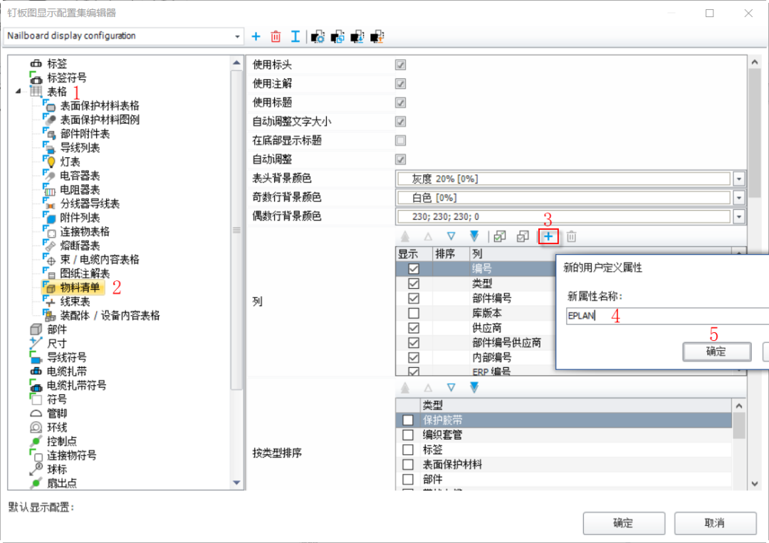 在【釘板圖點數配置編輯器】中,依次打開【表格】-【物料清單】,點擊加號,添加【用戶自定義的屬性】,填寫新屬性的名稱【EPLAN】,然后確定,保存配置,如下圖。