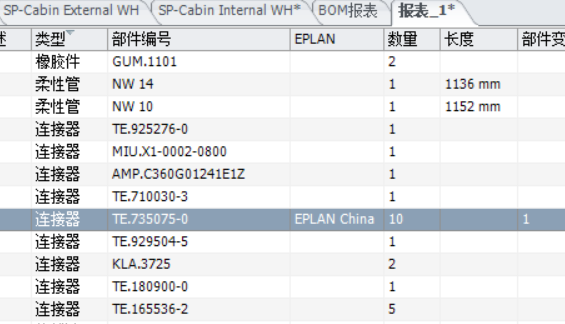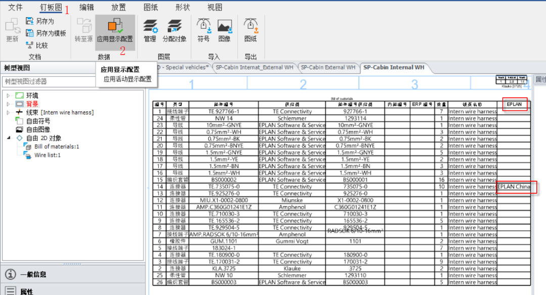 在菜單欄的【工作區】-【應用顯示配置】,更新上一步驟修改的釘板圖顯示配置,應用后如下圖效果,在線束的物料清單表中可以看到【TE.735075-0】的【EPLAN】列中的【EPLAN China】值,如下圖。