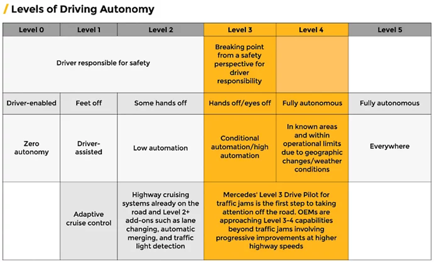 上面高亮顯示的黃色欄說明原始設備制造商在全自動駕駛方面取得的進展。目前他們正在開發介于L3與L4之間的解決方案;不過,他們會繼續深入探索L2與L3領域。就L3級而言,安全責任開始從駕駛員轉移到OEM。