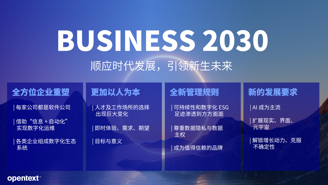 陳總在發(fā)言中表示,Micro Focus(現(xiàn) OpenText)的產(chǎn)品、解決方案及成功案例已廣泛具備全球領(lǐng)先水準(zhǔn)。而其推出面向未來的「Business 2030」藍圖,旨從“全方位重塑企業(yè)”、“更加以人為本”、“煥新管理規(guī)則”、“更新發(fā)展要求”等四大方向出發(fā),融合“信息”、“自動化”兩大要素,開展多領(lǐng)域、全方位、高維度的整體變革。