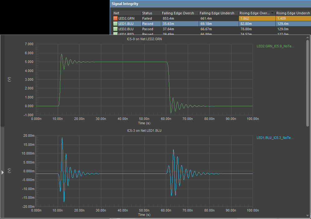 在設(shè)計(jì)階段,一些更先進(jìn)的ECAD軟件包可以用于在一些簡(jiǎn)單的仿真中識(shí)別信號(hào)完整性問題。可以一起執(zhí)行的兩個(gè)標(biāo)準(zhǔn)仿真是串?dāng)_波形計(jì)算和振鈴/反射波形。兩種仿真都需要為PCB布局布線中的驅(qū)動(dòng)元件定義邏輯系列,您可以在數(shù)據(jù)表中找到。這些仿真非常清楚地顯示了互連之間的端接和間距的有效性,請(qǐng)參閱下文的互連瞬態(tài)響應(yīng)。