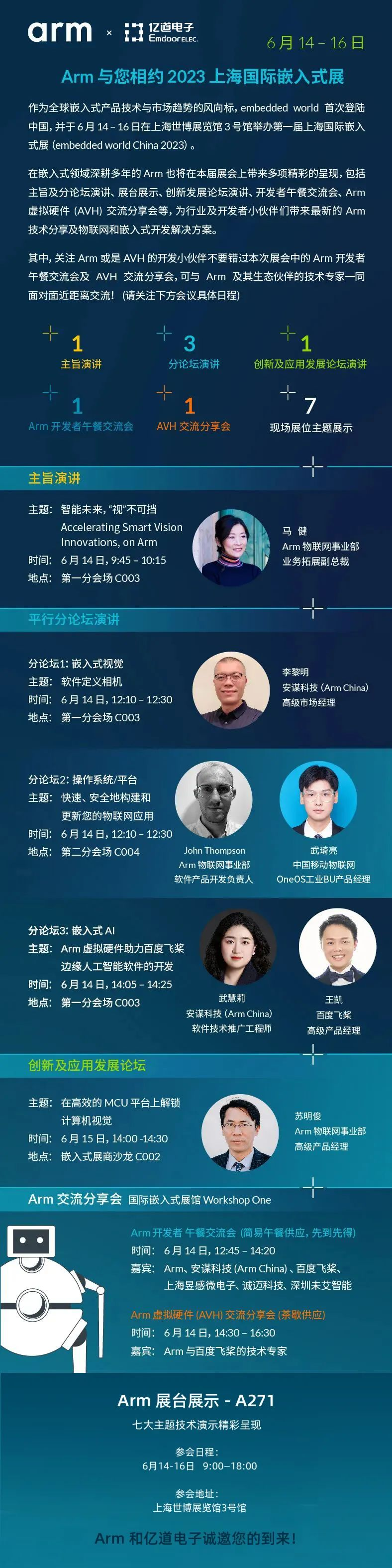在嵌入式領(lǐng)域深耕多年的 Arm 也將在本屆展會(huì)上帶來(lái)多項(xiàng)精彩的呈現(xiàn),包括主旨及分論壇演講、展臺(tái)展示、創(chuàng)新發(fā)展論壇演講、開(kāi)發(fā)者午餐交流會(huì)、Arm 虛擬硬件(AVH)交流分享會(huì)等,為行業(yè)及開(kāi)發(fā)者小伙伴們帶來(lái)最新的 Arm 技術(shù)分享及物聯(lián)網(wǎng)和嵌入式開(kāi)發(fā)解決方案。