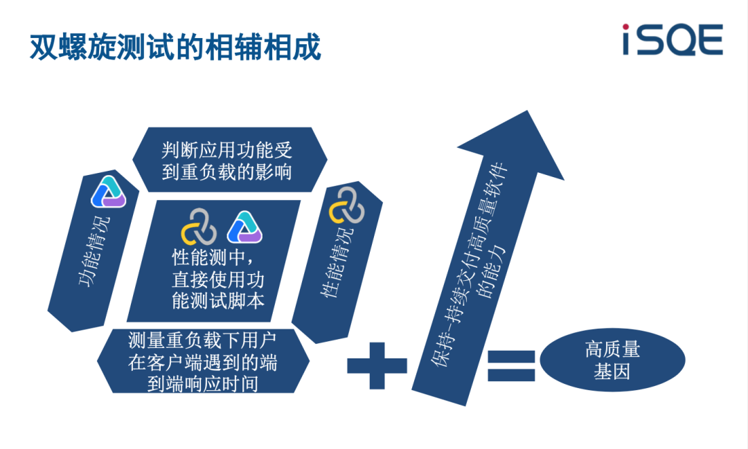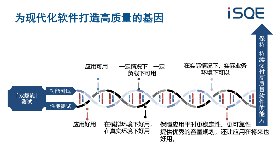 為現(xiàn)代化軟件注入高質量的基因,尤其要提到軟件測試的作用。為此,陳學鋒專門介紹了一種先進的測試解決方案——「雙螺旋」測試。它將兩種主要的測試方法,即全渠道的功能測試與面向性能工程的性能測試融為一體,像 DNA 分子一樣螺旋式纏繞,從多個測試環(huán)節(jié)多重驗證軟件的功能和質量表現(xiàn),以確保最終交付的軟件在多方應用環(huán)境之下都具備達標、甚至超出預期的穩(wěn)定性和可靠性。
