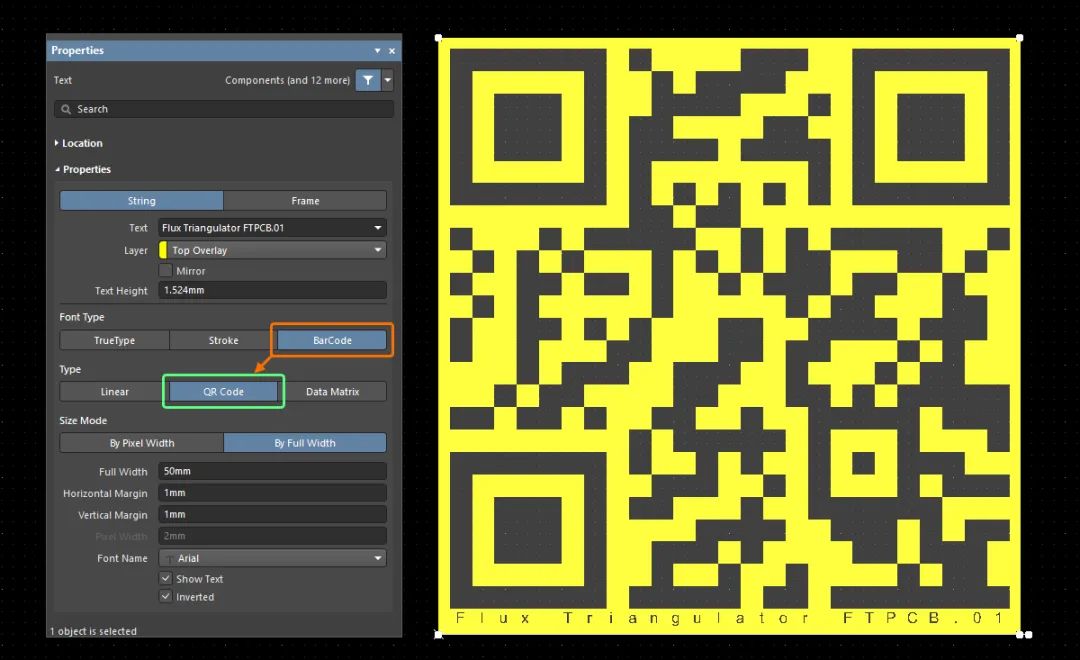 現(xiàn)在可以生成 QR 和 Data Matrix 代碼并將其放置在 PCB 設(shè)計(jì)中。為此,在選擇文本對(duì)象時(shí),在“屬性”面板的“字體類(lèi)型”區(qū)域中選擇“條形碼”,然后在“類(lèi)型”區(qū)域中選擇“QR 碼”或“Data Matrix”。
