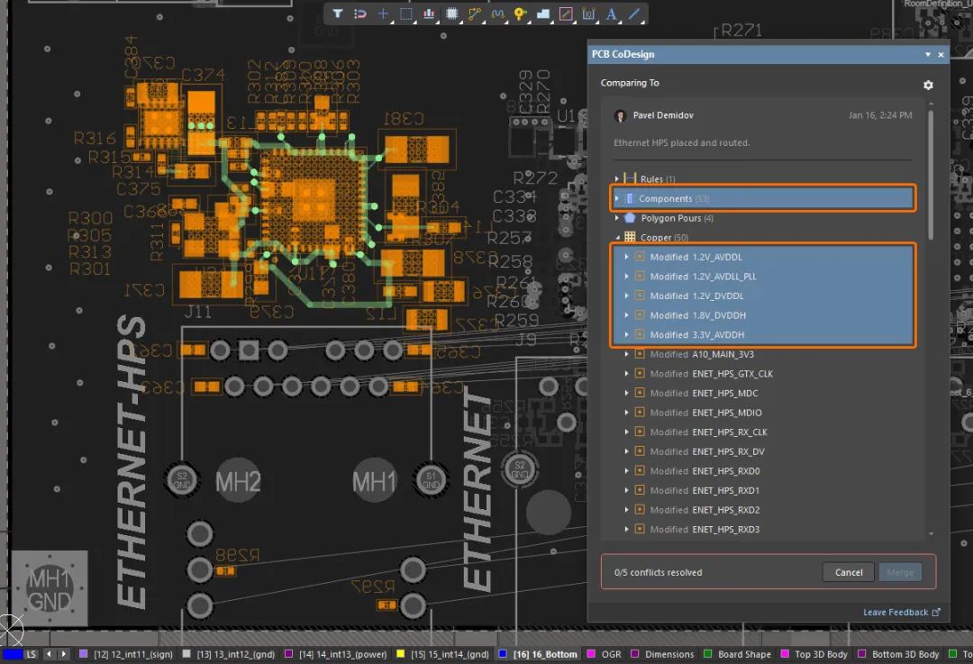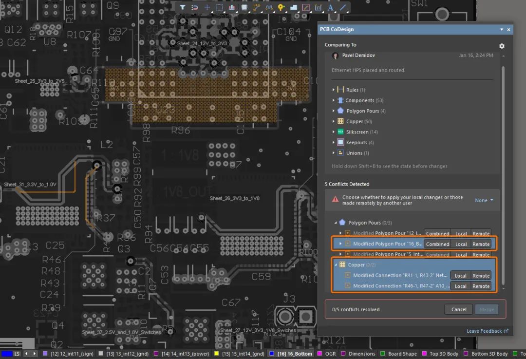 為了在使用 PCB 協(xié)同設(shè)計(jì)功能時(shí)更高效地查看更改,現(xiàn)在不僅可以在 PCB 協(xié)同設(shè)計(jì)面板中選擇單個(gè)修改和沖突條目,還可以選擇同一類(lèi)別或不同類(lèi)別中的多個(gè)條目。使用 Shift+單擊 和/或 Ctrl+單擊 技術(shù)選擇條目,并在 PCB 編輯器設(shè)計(jì)空間中突出顯示它們。