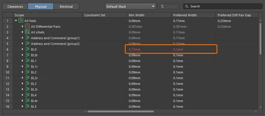 現(xiàn)在,在約束管理器的“物理”視圖的頂部網(wǎng)格中驗(yàn)證網(wǎng)絡(luò)和網(wǎng)絡(luò)類(lèi)的寬度約束,如果發(fā)現(xiàn)值無(wú)效(例如,如果約束的最小寬度大于首選寬度),則使用紅色文本突出顯示。