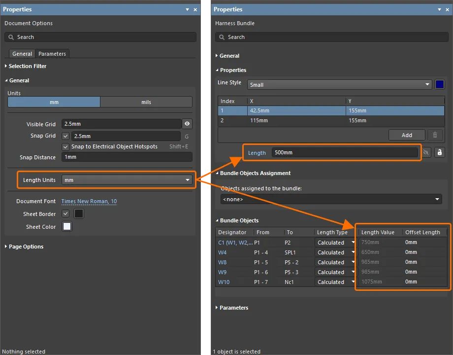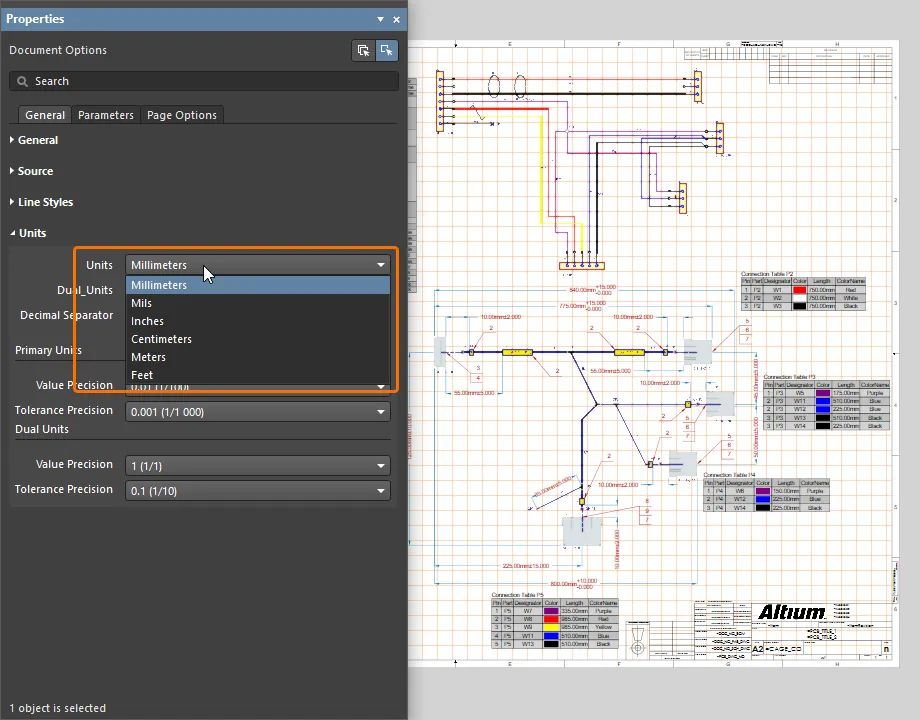 用于線束制造圖(*.HarDwf)的單位列表也已標(biāo)準(zhǔn)化。支持的單位與上述相同(增加了 mils)。此外,可以為 BOM 表、接線列表和連接表指定長(zhǎng)度單位(覆蓋文檔級(jí)別指定的單位)。