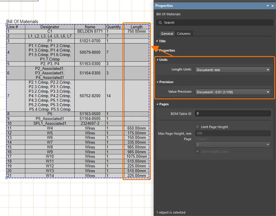 選擇 BOM 表時(shí),使用屬性面板指定此表中長(zhǎng)度值使用的長(zhǎng)度單位及其值精度。