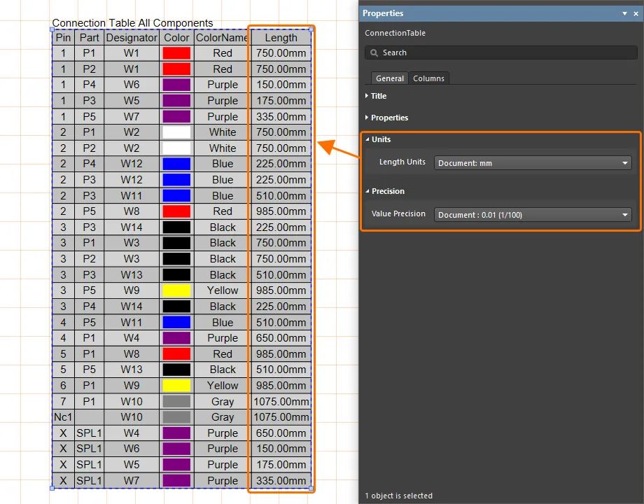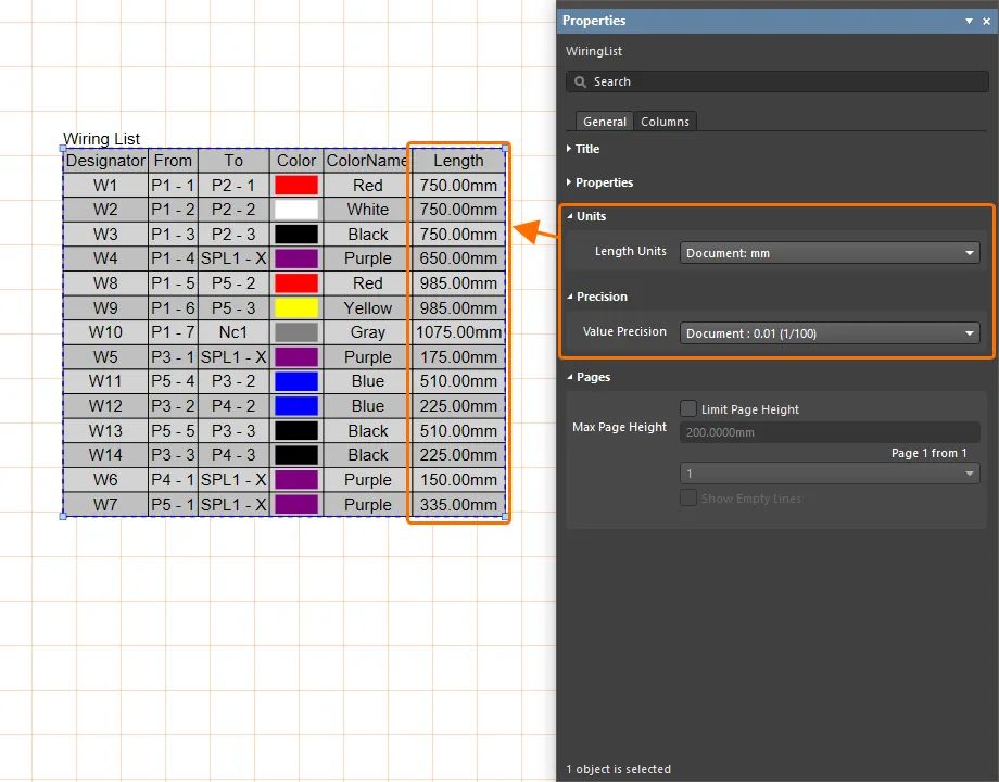 選擇接線列表時(shí),使用屬性面板指定此表中長(zhǎng)度值使用的長(zhǎng)度單位及其值精度。