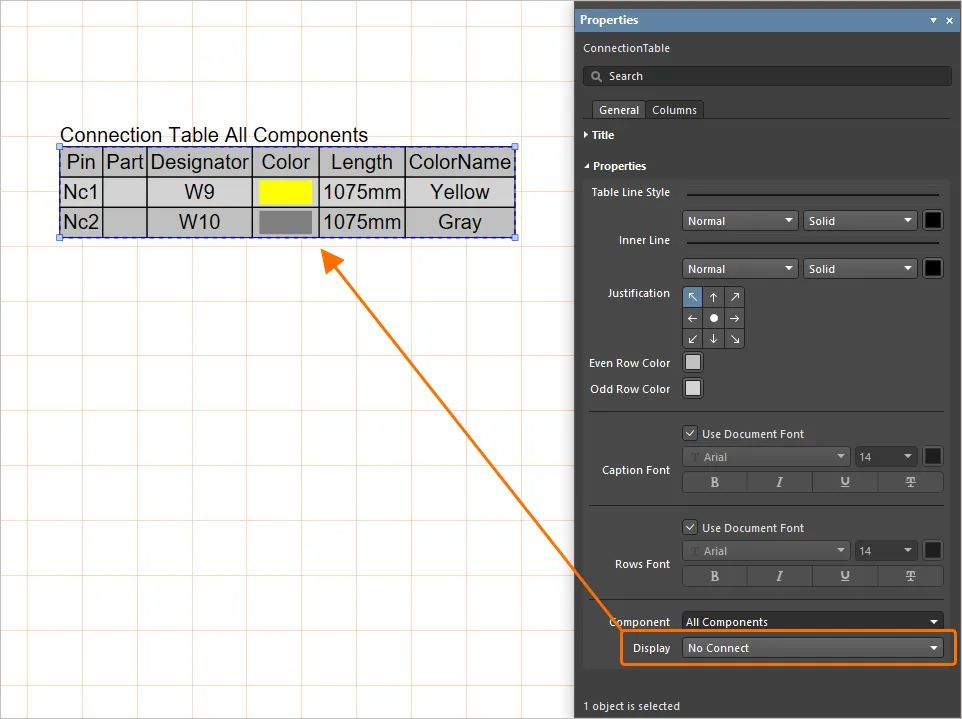 在線束制造文檔(*.HarDwf)的連接表中,現(xiàn)在可以僅顯示“未連接”對(duì)象。為此,在選擇連接表時(shí),從屬性面板的“屬性”區(qū)域的“顯示”下拉菜單中選擇“未連接”選項(xiàng)。