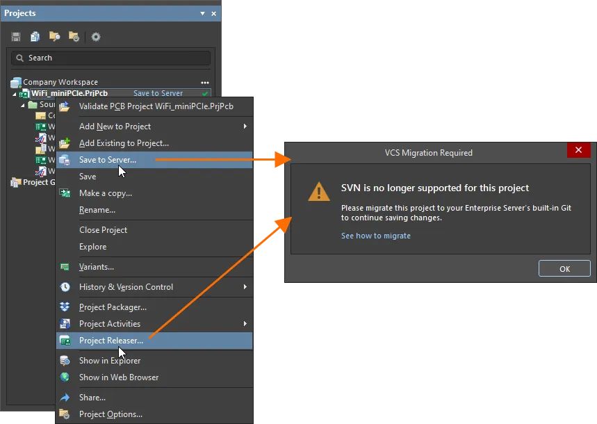 作為Altium On-Prem Enterprise Server中結(jié)束 SVN 支持的一部分,不再可能提交和發(fā)布在連接的Enterprise Server工作區(qū)中使用 SVN 進(jìn)行版本控制的項(xiàng)目。您現(xiàn)在將看到一個(gè)對(duì)話框,要求您將項(xiàng)目從 SVN 存儲(chǔ)庫(kù)遷移到Enterprise Server的內(nèi)置 Git 存儲(chǔ)庫(kù)。