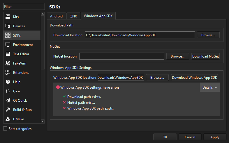 我們?cè)谠O(shè)置界面新增了"首選項(xiàng)>SDK"分類,用于集中管理Android、QNX、MCUSDK的設(shè)置,并新增了Windows應(yīng)用SDK的配置入口。