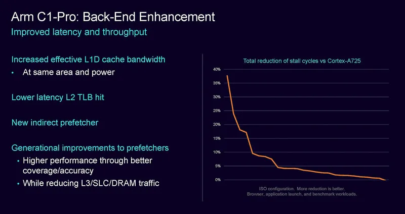 C1-Pro在后端上提升了數(shù)據(jù)L1緩存的帶寬,優(yōu)化L2的TLB延遲,新增了間接預(yù)期器,提升預(yù)取的性能和減少L3到SLC和內(nèi)存的數(shù)據(jù)擁塞。