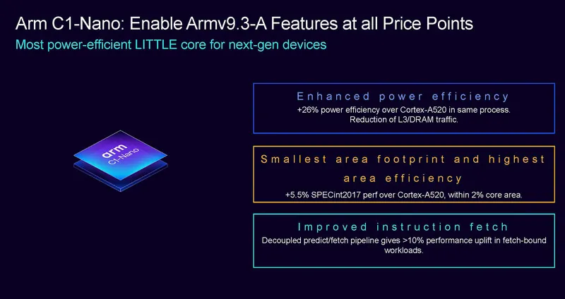 下面我們來(lái)看一下C1-Nano核心,這也是一顆Armv9.3-A架構(gòu)的處理器。Arm宣稱(chēng)C1-Nano相比A520提升了26的效能,并有效減少L3到內(nèi)存的擁塞。性能上,在不到2的核心面積增加下(小核心很在意核心面積),性能可以提升5.5。還通過(guò)解耦預(yù)測(cè)和取指流水線(xiàn),提升了指令預(yù)取的性能。