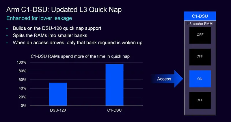 DSU是連接多個(gè)處理器核心的關(guān)鍵模塊,這一代的新DSU命名為C1-DSU。這一代的C1-DSU,Arm宣稱(chēng)功耗可以節(jié)省11,Quick Nap內(nèi)存(L3支持的功能)功耗可以降低7。