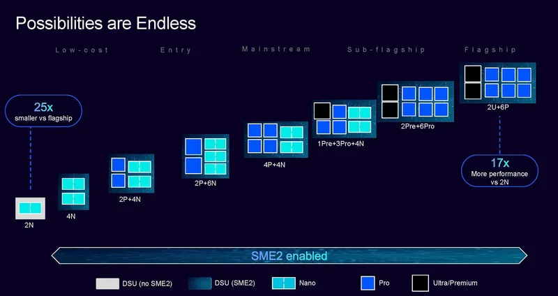 和上一代一樣,C1-DSU最多可以支持14個(gè)處理器核心的組合,并且可以實(shí)現(xiàn)不同C1處理器的組合,除了最初級(jí)的2核心配置,其余都可以支持SME2。