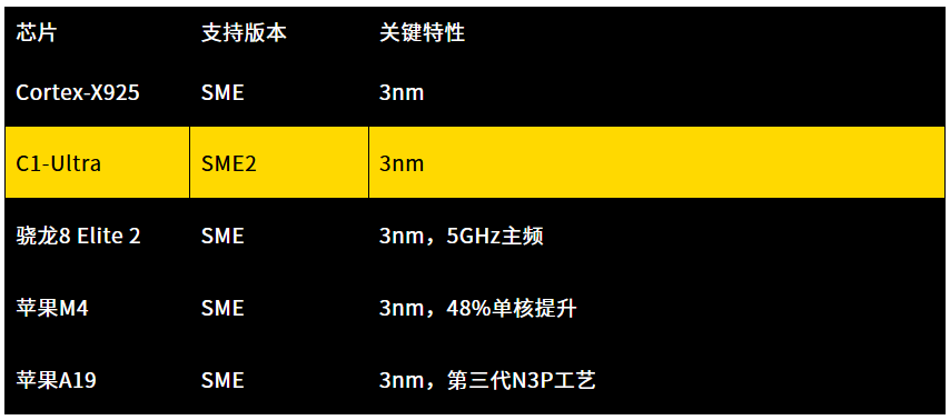 SME(Scalable Matrix Extension,可擴(kuò)展矩陣擴(kuò)展)是Armv9架構(gòu)引入的指令集,雖然SME指令集在2021年就提出了,但是Arm的Cortex-X系列處理器從X925才開(kāi)始支持第一代的SME指令集,蘋(píng)果公司的M4處理器和今年的A19處理器也支持第一代的SME指令集,最新的高通的8 Elite 2處理器也可以支持SME指令集。今年的Arm C1系列則全面升級(jí)到了SME2指令集。
