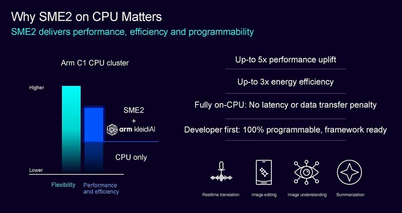 在性能表現(xiàn)上,Arm宣稱(chēng)SME2對(duì)性能上有顯著幫助,例如在AI任務(wù)中,SME2可使CPU集群的AI性能提升5倍,同時(shí)實(shí)現(xiàn)了3倍的能效提升。由于AI類(lèi)計(jì)算需要調(diào)用非常多的矩陣計(jì)算,因此SME2在AI類(lèi)應(yīng)用中尤為有效。