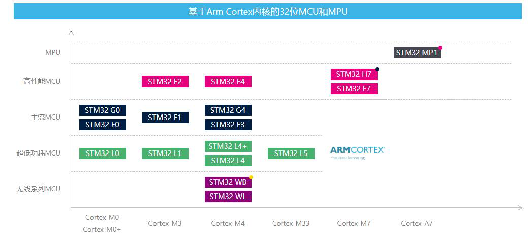 目前來說,STM32MCU產品提供16大產線、5類產品、超過1000個型號,基于ARM?Cortex?M0、M0+、M3、M4、M33、M7、A7內核: