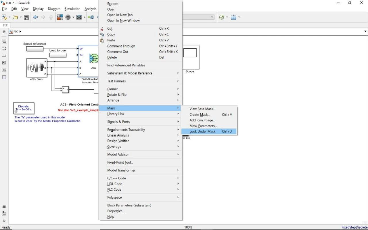右鍵點擊Field-Oriented Control Induction Motor Drive模塊,按下圖操作可看到此模塊內部的具體結構。