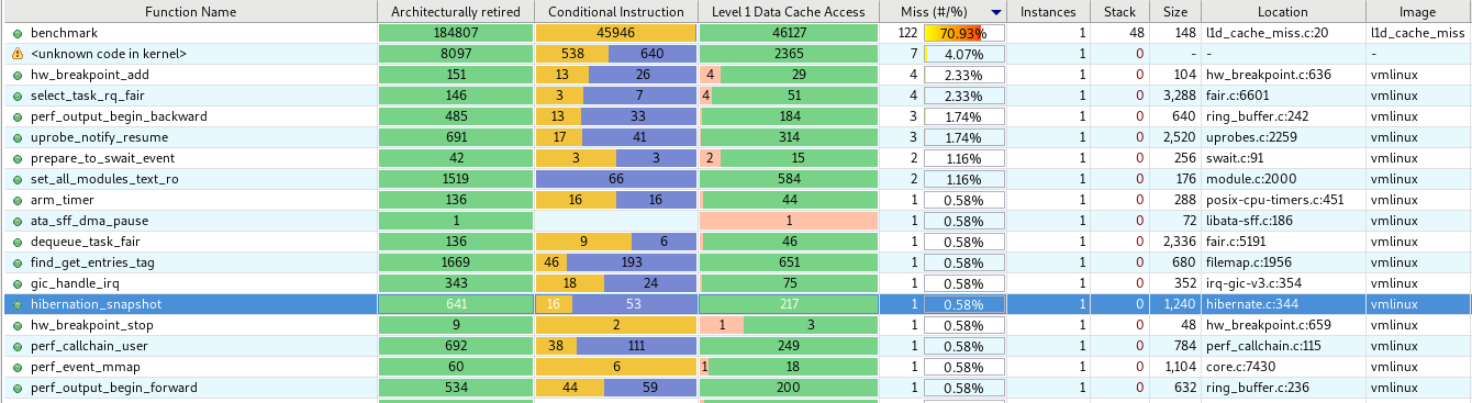 比如Architecturally retired圖顯示了采樣的指令后完成了和沒有完成的數量,總量顯示了冒險執行的總指令量。類似地, Level 1 Data Cache Access圖顯示了采樣指令中含有對L1數據緩存存取指令總數,以及hit/miss比例。