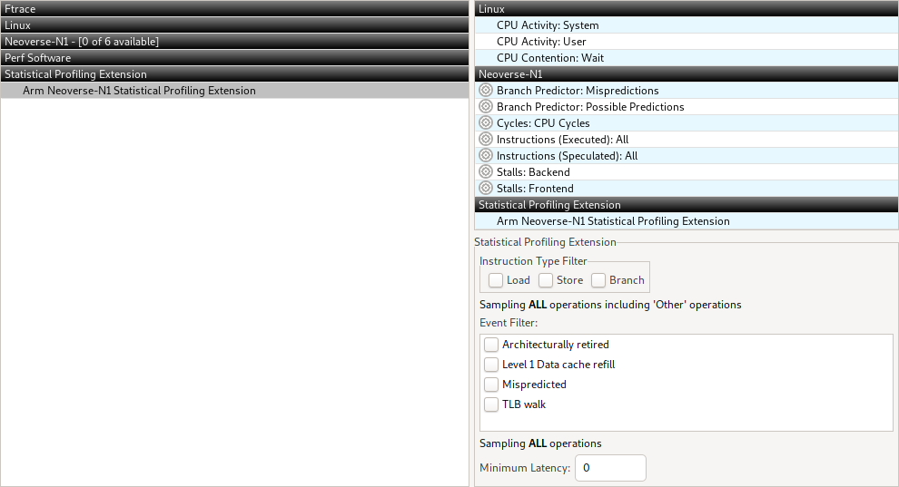 啟動Streamline,連上設備,從計數器配置窗口可以看到Arm SPE(Statistical Profiling Extension)配置界面