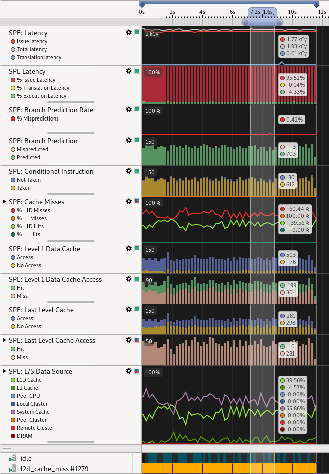 下圖顯示添加了更多SPE計數器的時間圖。SPE事件包內的多種屬性顯示再堆疊圖上。這些圖顯示了某種屬性在樣本中存在和不存在的比例。白色方塊中顯示再所選事件內包含某種屬性樣本的總和。有些屬性和某些特定類型的指令相關,比如分支,存取。