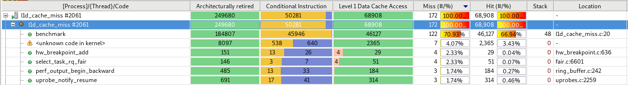 事件包顯示了每個函數中符合條件和不符合條件的采樣比例,以及每個線程和進程中事件的加總數。通過點擊第一列的表,可以將這些比例單獨成列用來排序,這些獨立的列顯示了符合條件的事件量,以及占總量的比例。通過對這些列的排序,可以確定哪些函數導致緩存存取失敗,或哪些函數導致分支預測失敗率高。