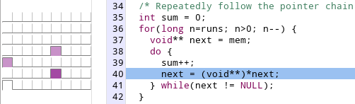 如果分析的程序包含調試信息,視圖還會顯示代碼行信息,如果運行Streamline的機器上關聯了被調試程序的源碼,代碼欄的上半部分會顯示被選擇函數的源碼,同時每行代碼運行帶來的計數器變化也會顯示。這可以用來識別函數中需要特別處理代碼塊。