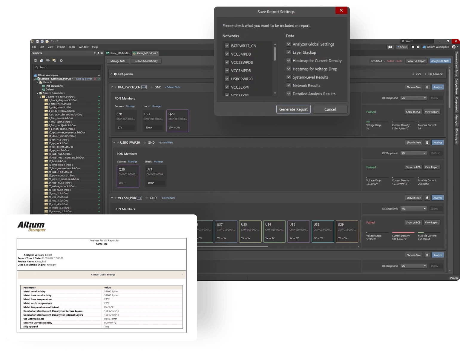 - 檢查電路板上任何位置的電壓、電流密度和過孔電流