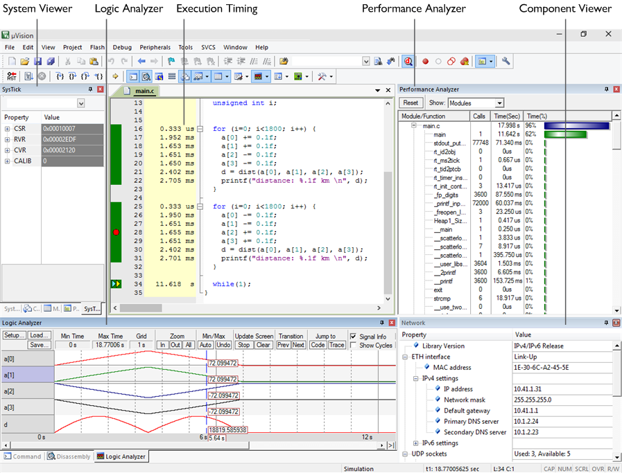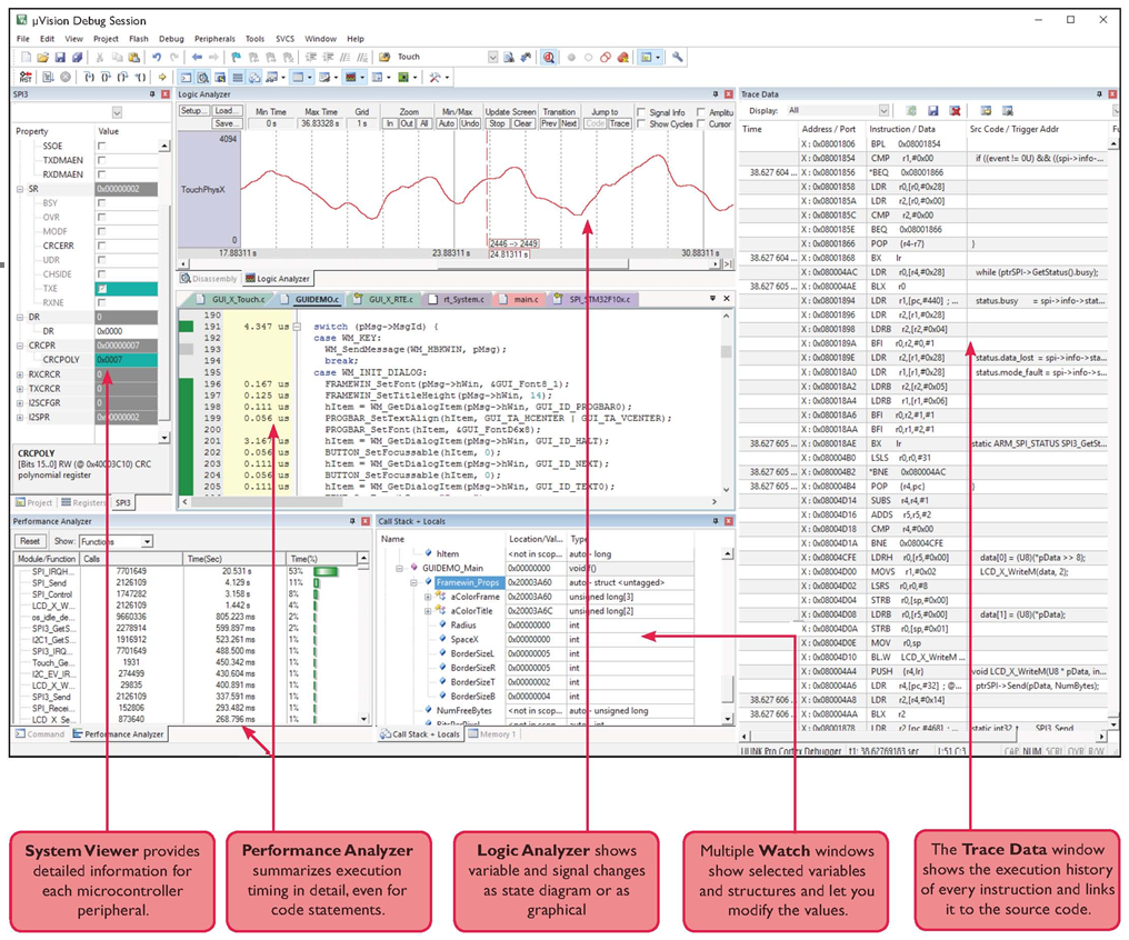 當配合ULINKPro使用streaming trace功能時,分析工具可以展示出程序是怎么執行的。代碼覆蓋提供認證測試和驗證的詳細執行統計數據。性能分析和執行分析器可以查明和優化程序中的熱點。